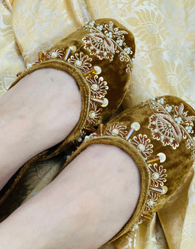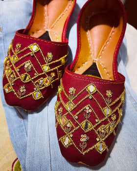 These khussas are a combination of traditional mirror work enhanced with gold zari-threads on a maroon base, which is embellished with golden sequence and shiny stones adding an elegant touch...