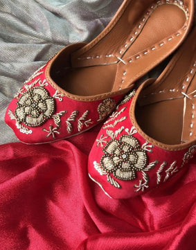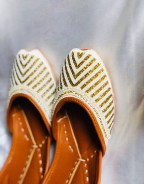 Beautiful blend of kora dabka, cut daana with semi precious copper pearls all over the juttis.