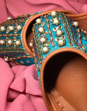 A pair of khussas adorned with very elegant pearls and kora dabka embroidery all over the jutti. ♥ This shade of blue 💙 is just so happy, regal and absolutely...