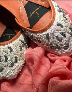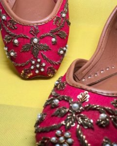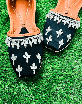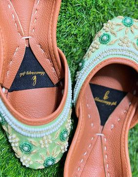 These khussas are a combination of traditional sequence kora dana work and embellished with semi precious pearls which add festive vibe in every step that you take!