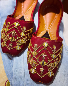 These khussas are a combination of traditional mirror work enhanced with gold zari-threads on a maroon base, which is embellished with golden sequence and shiny stones adding an elegant touch...