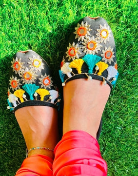 silk black base with very elegant multi color flower embroidery all over the juttiπ€© Our khussas are created to keep your comfort in mind with double padded sole for a...