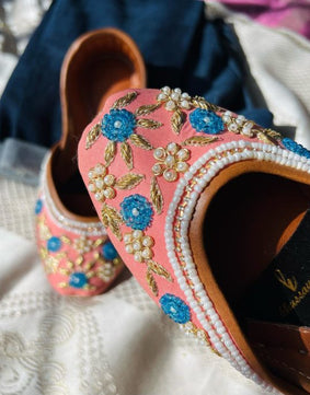 These khussas are a combination of traditional kora dabka and gota work and embellished semi precious pearls which add festive vibe in every step that you take! ππ Colors can...