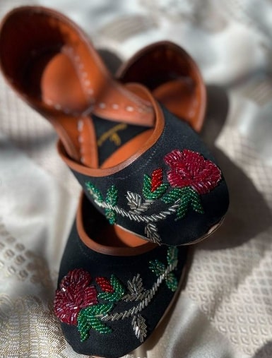 AQEEQ These khussas are a combination of Ruby red crystalline rose having small green leaves embellished with silver cut-dana embroidery