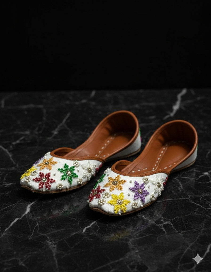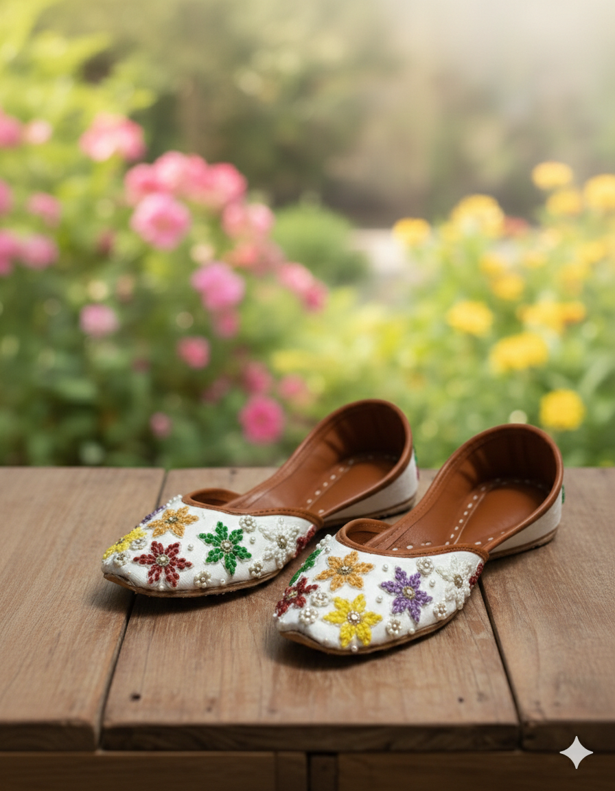 • The beautiful embellishment of colorful flowers on this white based khussas are here to glorify your look this Eid🤍•Contact +92 312 3059728 for order and details