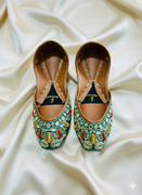 Creamy beige base with white pearls and cut-dana arranged in a flowy lining elusive pattern and flora style adorned with yellow-black threads makes it a classy pair for a gleaming chic look.