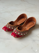 • Introducing Zeenat black base with gold beeds and tiny white pearls spread beautifully all over the jutti.