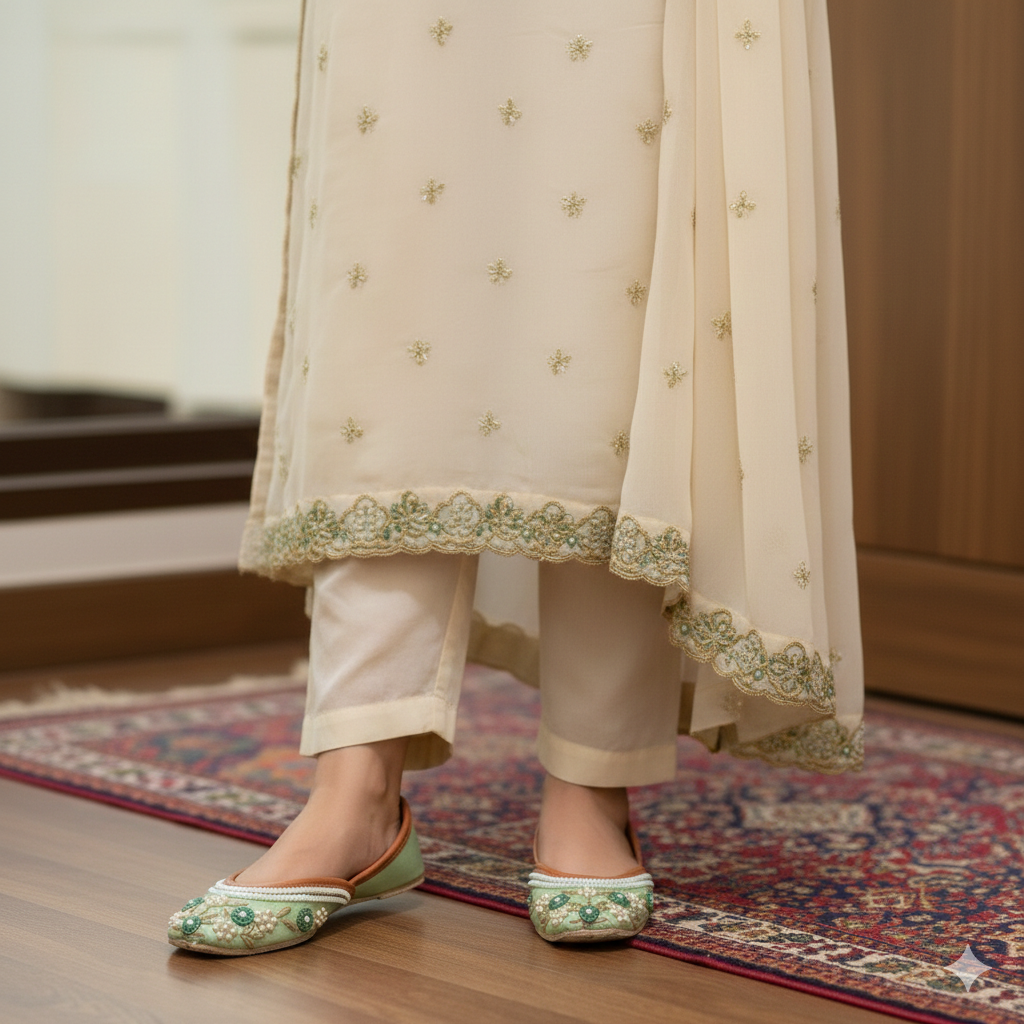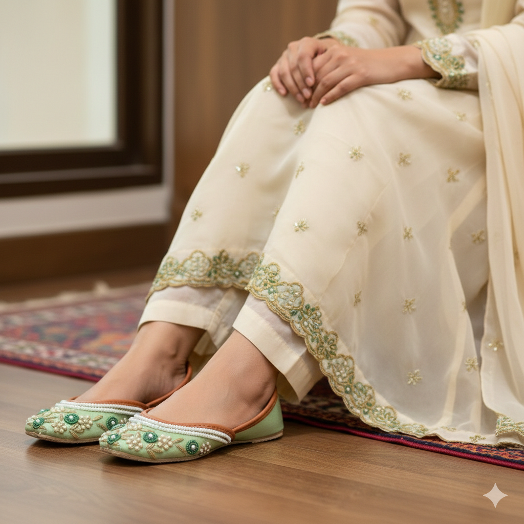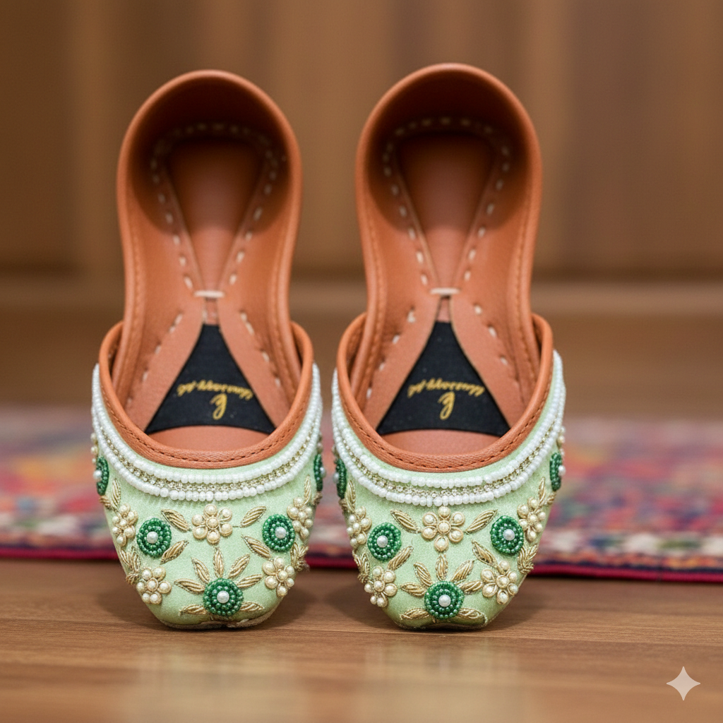Semi precious pearls on this pista green base is here to exemplify the art of decency
