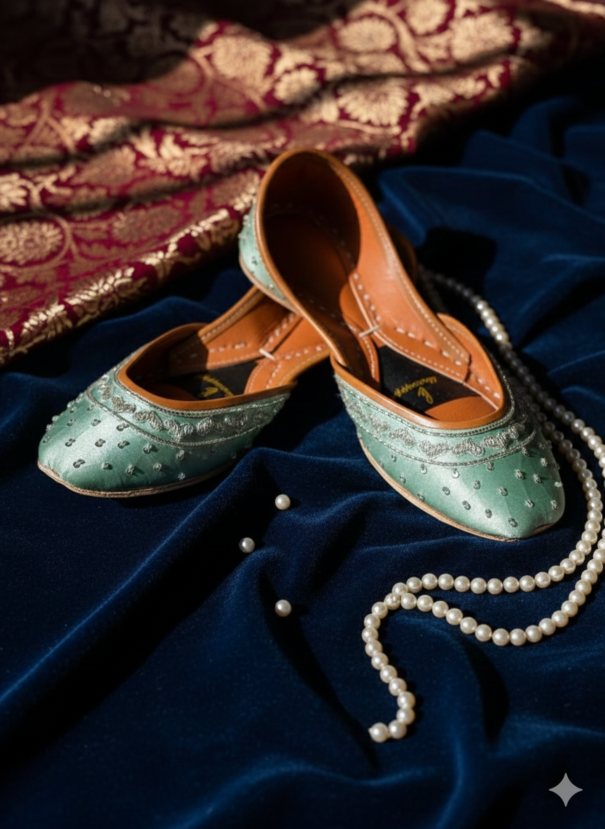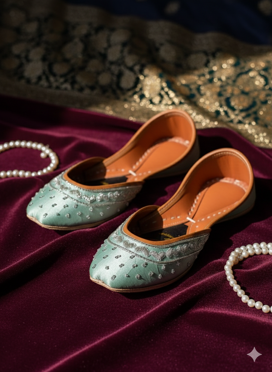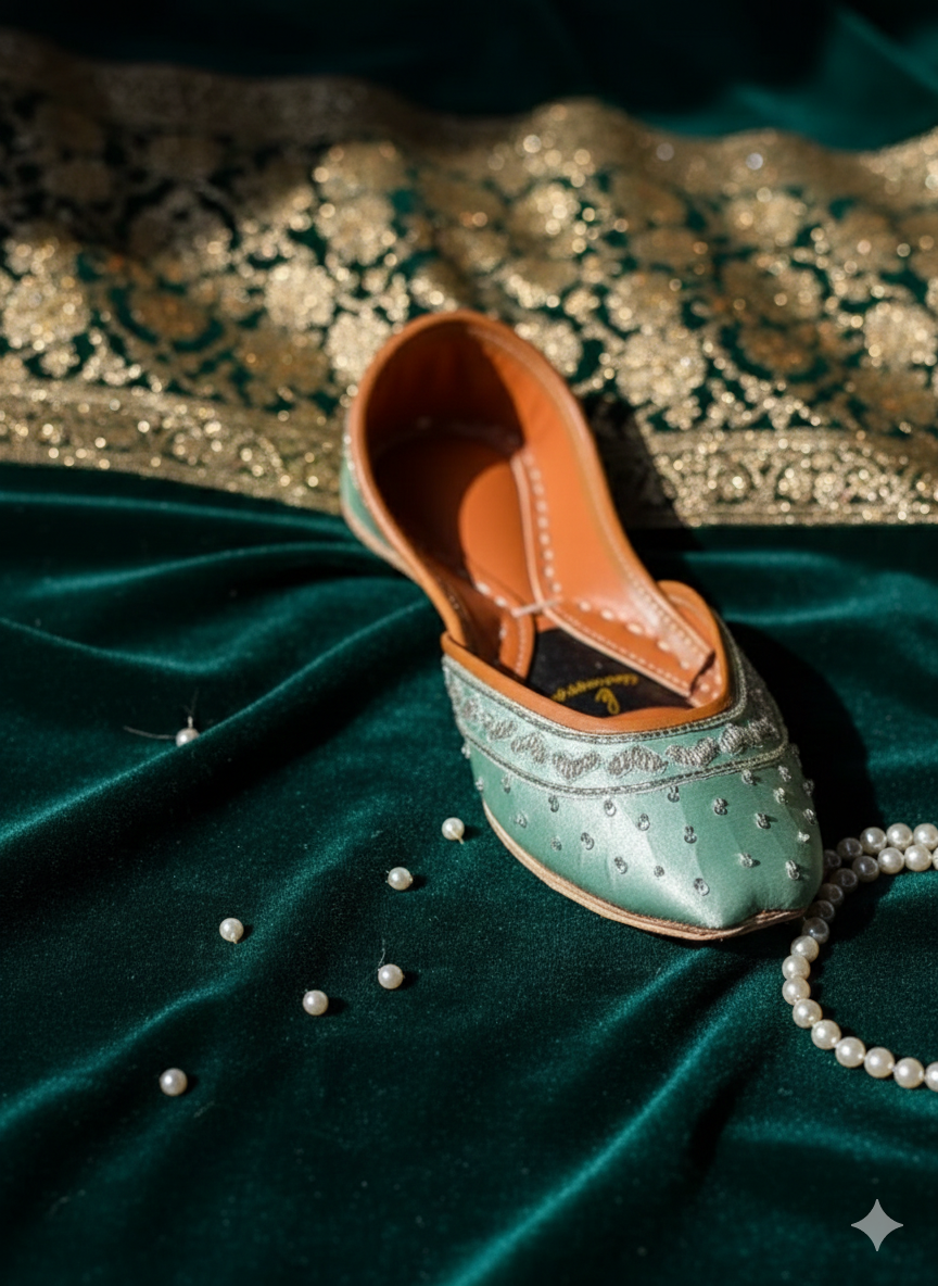 Soft pista/ mint with silver champagne hearts to melt your hearts. Composition; upper – silk with intricate hand embroidery Back: silk lining- vegan faux leather, sole vegetable tanned leather, double...