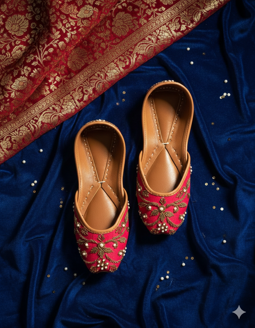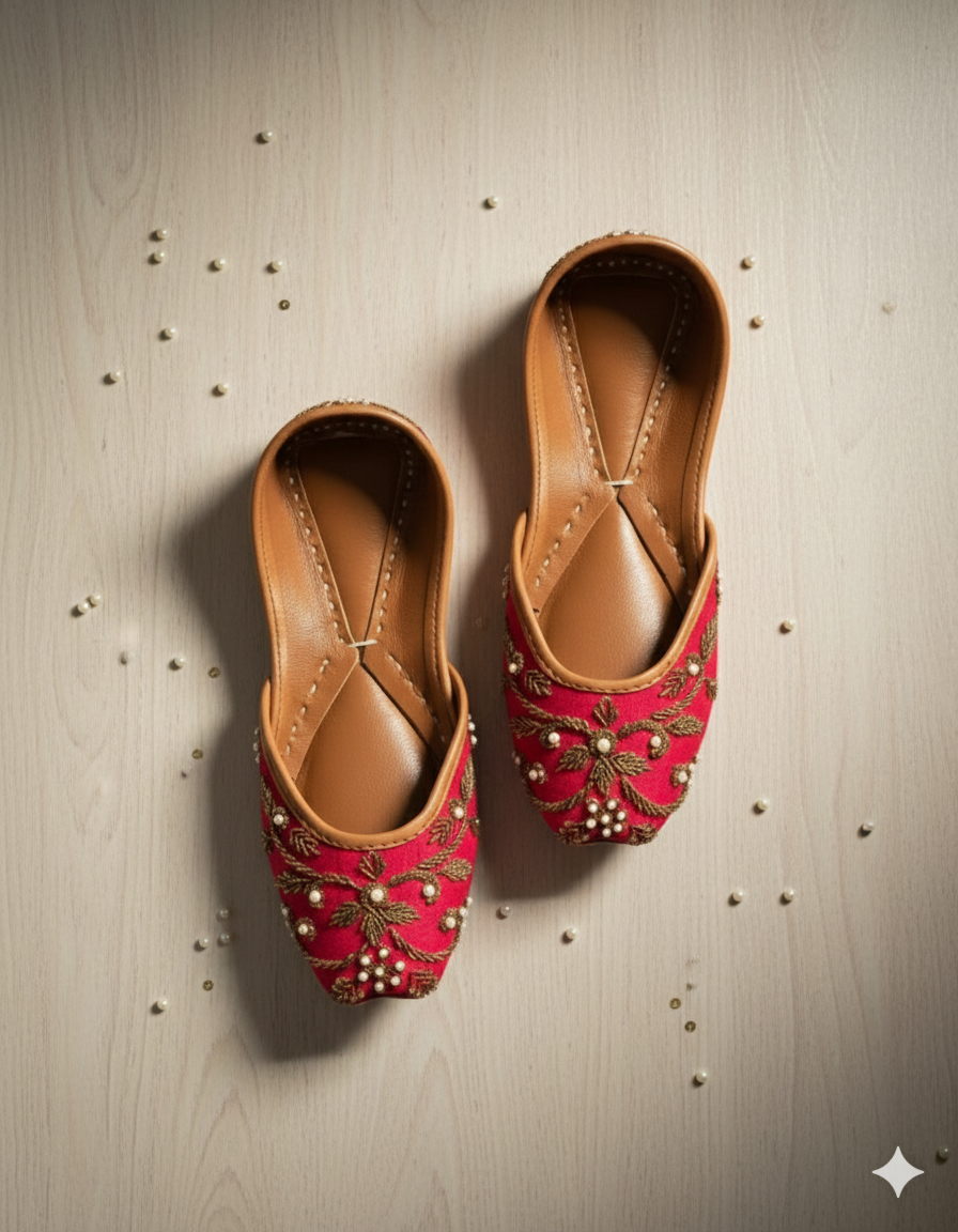 Red base with white tiny pearls spread beautifully all over the jutti in addition with the traditional kora dabka and sequence work which make it perfect for your shaadi events🤩♥...