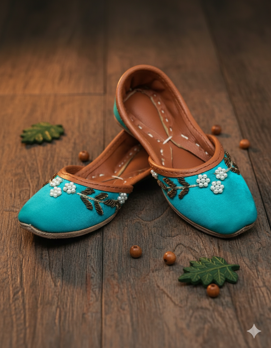 silk base khussas adorned with very elegant pearls and kora dabka embroidery at the front. These shades of blue and green is just so happy, regal and absolutely beautiful !...