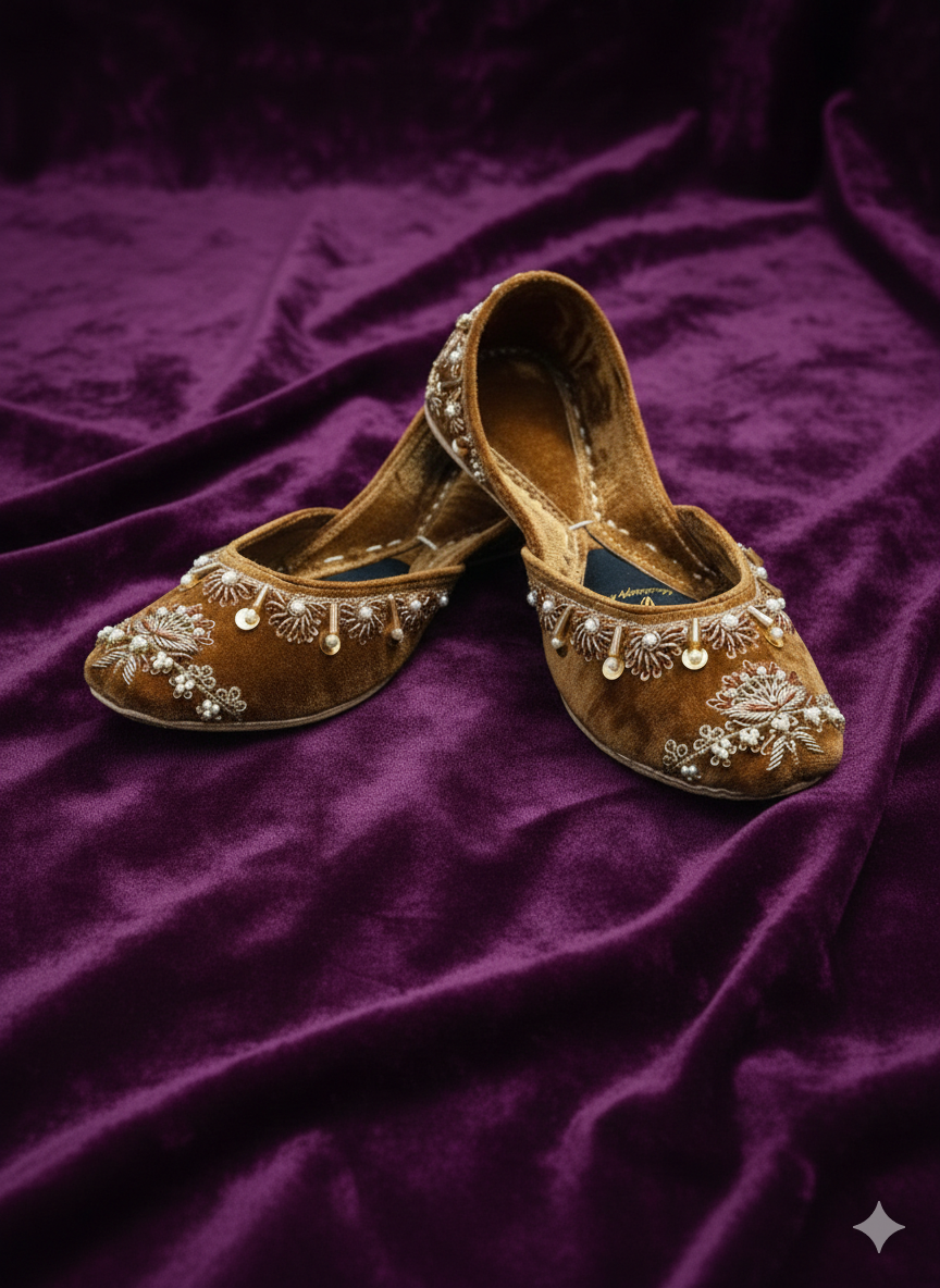 Mustard brown velvet with very elegant combo of gold n champagne crystals and dabka hand work is surely increasing its beauty with elegance!