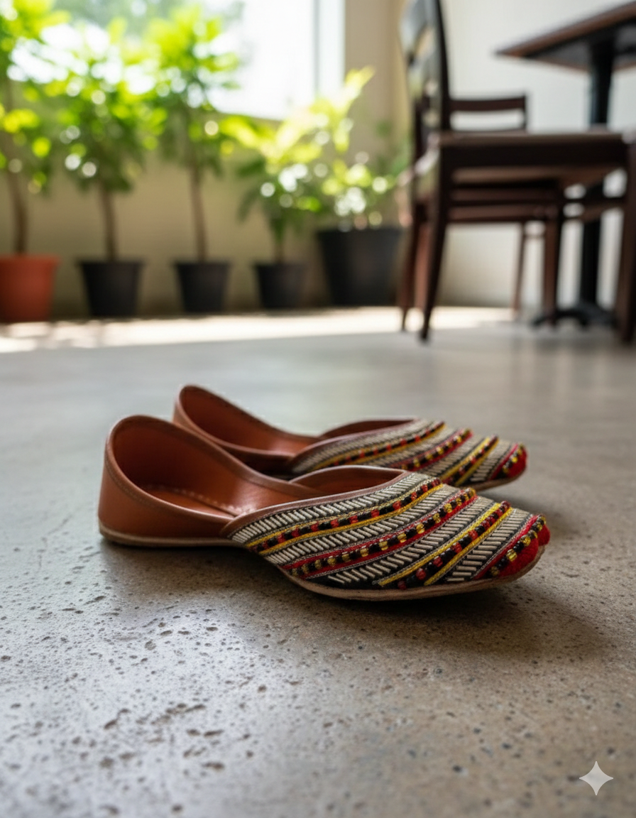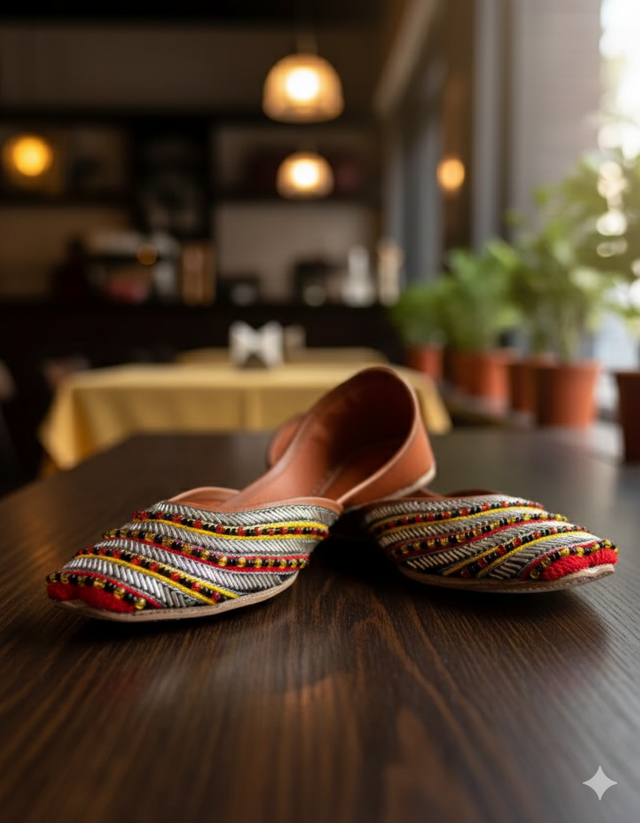 These khussas are a combination of traditional cut-daana work enhanced with fine yellow & red threads adored with multi-colored vibrant pearls