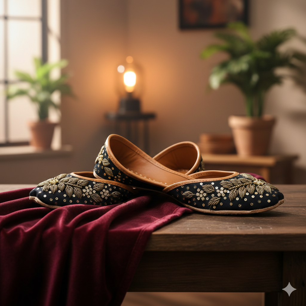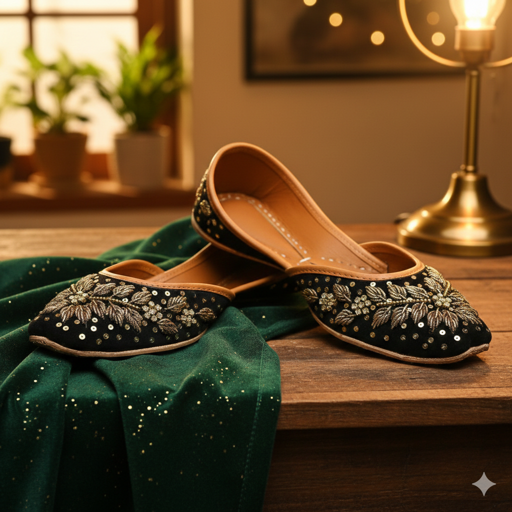Black silk base with copper kora dabka embroidery with a splash of very elegant gold sequence all over the jutti.🖤Our khussas are created to keep your comfort in mind with...
